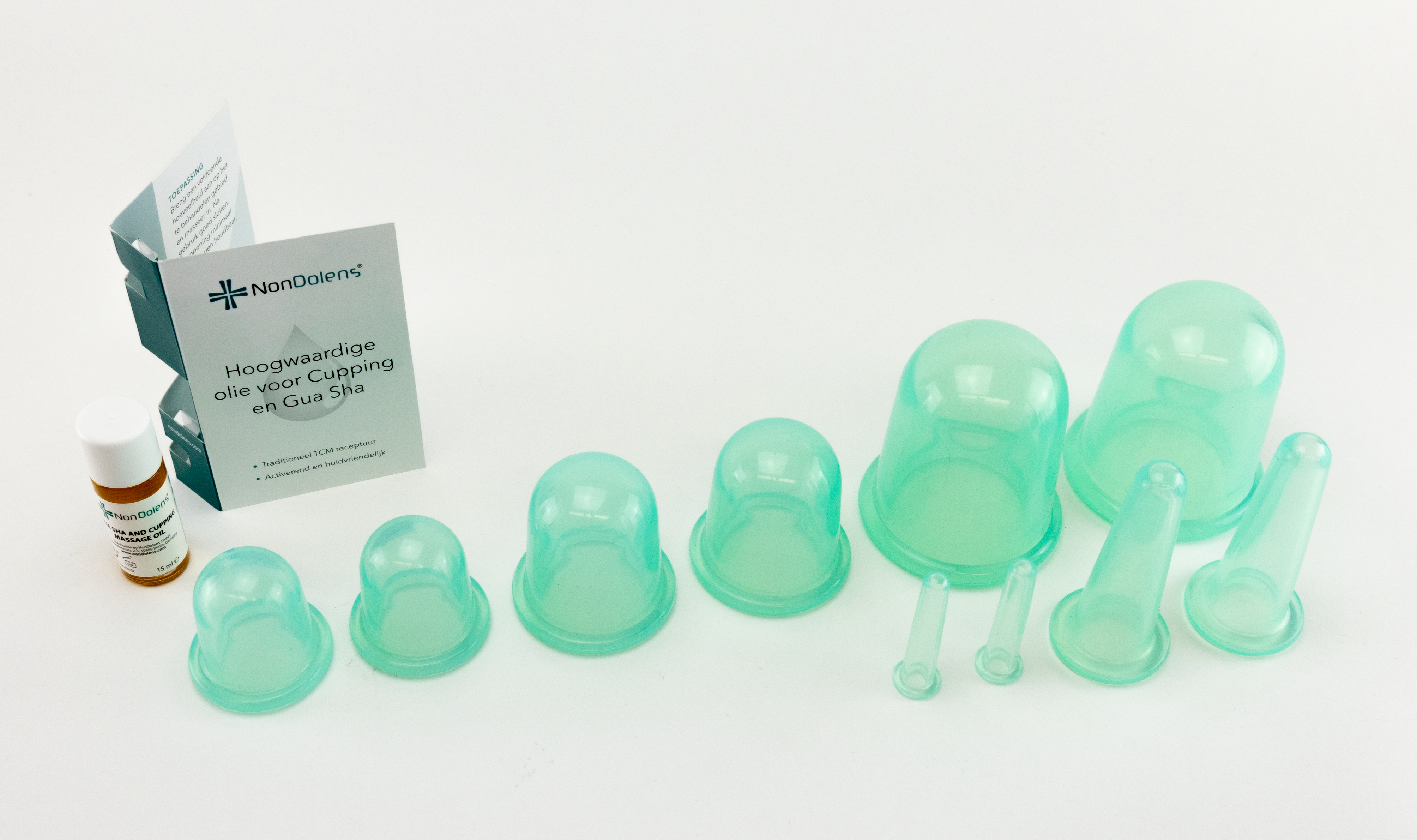 Met materialenpakket met tien siliconen cups en een flesje massageolie