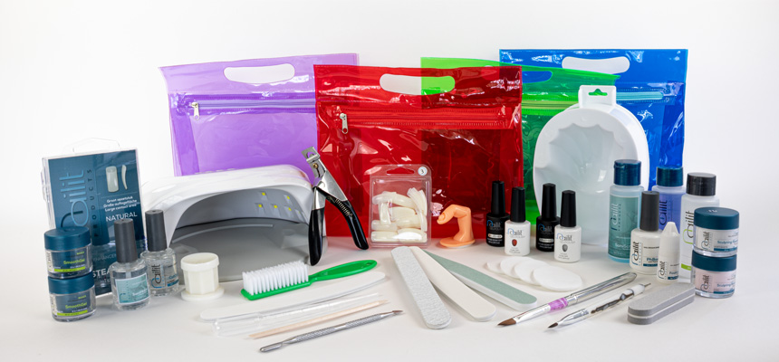 Handige beautytasjes voor elk systeem met o.a. de volgende producten en materialen: UV/LED Baseprotect, Topgloss, SaniScrub, witte gellak, kleur gellak, manicurebowl, nailpads, oefenvinger, 150 tips, tiplijm, SaniPREP nagelvoorbereider, CutiSoft nagelriemolie, PhBond zuurvrije primer, diverse vijlen, buffer en polijstvijl, metalen bokkepoot, tipknipper, hygiene materialen, manicure borsteltje, Nailit acrylvloeistof en poeders, penseel, glazen vloeistofhouder, pipet, Nailit UV-Smoothgel white en clear, Nailit UV-gel cleanser, penseel, 75 watt LED lamp, marblepen / dottingtool, enz.