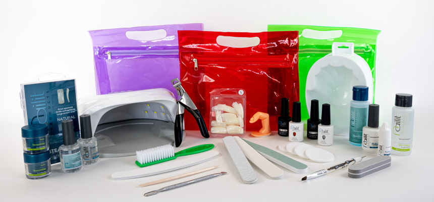 Handige beautytasjes voor elk systeem met o.a. de volgende producten en materialen: UV/LED Baseprotect, Topgloss, SaniScrub, witte gellak, kleur gellak, manicurebowl, nailpads, oefenvinger, 150 tips, tiplijm, SaniPREP nagelvoorbereider, CutiSoft nagelriemolie, PhBond zuurvrije primer, diverse vijlen, buffer en polijstvijl, metalen bokkepoot, tipknipper, hygiene materialen, manicure borsteltje, Nailit acrylvloeistof en poeders, penseel, glazen vloeistofhouder, pipet, enz. Ten behoeve van de UV/LED gellak wordt een 75 watt LED lamp bijgeleverd.
